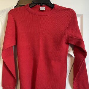 Included in this listing are TWO (2) thermal shirts. One is white from Hanes and the other is red from Greatland Thermal. They both have crew necks and long sleeves. Perfect under layer for additional warmth without bulk. Size Large.