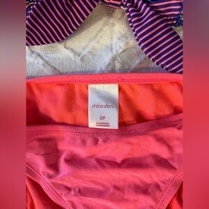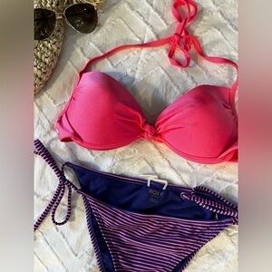 Receive two interchangeable bikinis with this purchase. Four pieces in total. The Roxy bikini is from Ron Jon’s (Cocoa Beach) and is new without tags (see pictures in this listing)