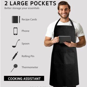 Crafted from 100% premium cotton, these adjustable bib aprons are soft, durable, and thicker than standard polyester for superior comfort and stain protection. Featuring a flattering fit, two spacious pockets, and a chic black finish—perfect for both home cooks and professional chefs.