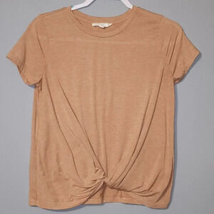 One is a light orange/peachy color with a knotted front hem. This one is size medium.