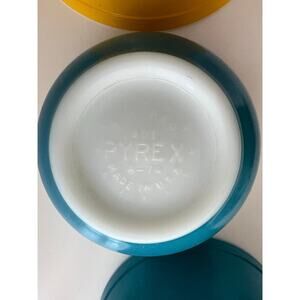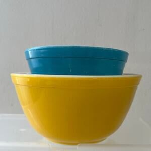 This set includes two charming Pyrex Blue #401 mixing bowls, each with a 1.5-pint capacity, and one cheerful Yellow #402 bowl with a 1.5-quart capacity. These vintage bowls are perfect for adding a touch of retro style to your kitchen. They're great for mixing, serving, or displaying. Don't miss out on this lovely set! No cracks or chips!