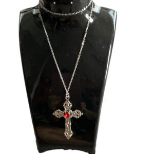 Silver cross necklace with red center stone