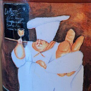 The other mug features a repeating wraparound scene of a mustached chef dressed in crisp white jacket, red bandanas, and traditional tall, white, pleated hat. He stands in front of a black chalk board restaurant menu that reads, Le Menu. In his right hand he holds a stemmed glass of white wine while his left arm is wrapped around three long loaves of French bread / baguettes,