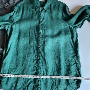 Two 100% linen shirts from Uniqlo (selling together). One shirt is pine green, and the other is charcoal gray. Both size XL and have the same measurements. Washed once (air dried), never worn. Original price for each was $39.90, selling two together for $40. Let me know if you have a question or need more measurements. I'm happy to help.