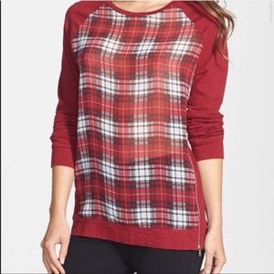 Two by Vince Camuto grey long sleeve top with sheer plaid front panel and asymmetrical left side seam zipper.