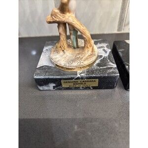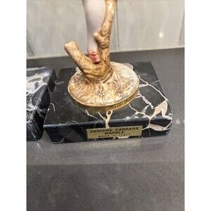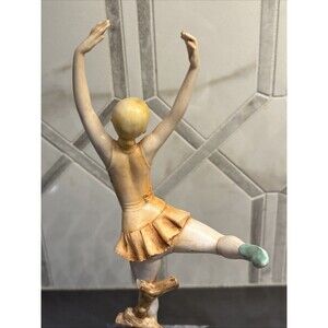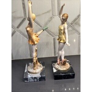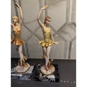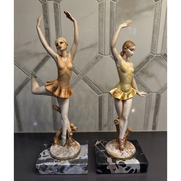 These vintage Simonetti Depose Italy ballerina figurines #351 & 352 are intricately hand-painted collectibles from the 1950s - 1960s. Crafted with a Carrara marble base, these medium-sized figurines feature a beautiful marbled design and depict a ballerina in a posing position.