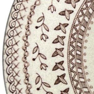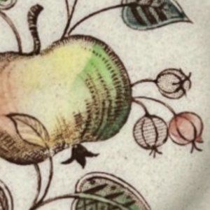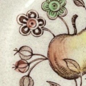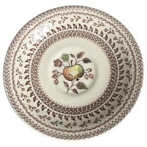 This beautiful pattern features a HAND-ENGRAVED design of fruit and flowers in the center in lovely muted shades of green and rose with an ornate design around the rim in brown, all set against a dreamy cream background. They're so charming!