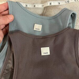 (See photos) A set of TWO VUORI Pose Plyo Tanks in Chia (or Java?) color, and Moss Green color - both size Medium.