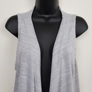 Comfy, open-front, sweater vest with pockets. Grayish blue heather-like color. Very pretty with light-washed jeans.