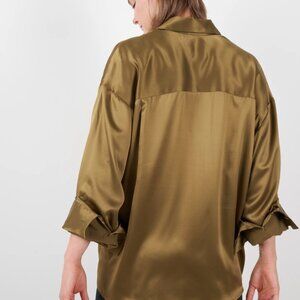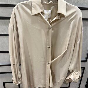 Model photos show the structuring of the blouse; color is suntan as seen in solo shirt photos.