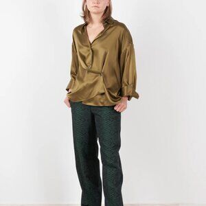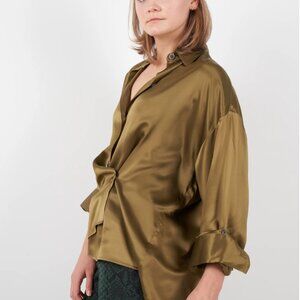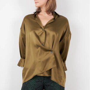 Cut from rich silk, this polished blouse is styled with roll-tab sleeves and asymmetric front buttons, which means you can wear this many ways. Spread collar and long sleeves with roll-tab cuffs. High-low shirt. 100% silk and made in the USA.