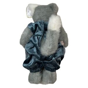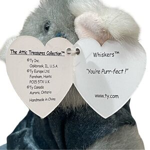 Adorable gray plush cat toy by TY. Perfect for cuddling and playtime. Soft and huggable with charming details. Ty Beanie Baby from the Attic Treasures Collection, specifically "Whiskers" the cat. This collectible plush toy, made by Ty, was first produced in 1993 and is known for its soft, gray and white fur, blue eyes, and pink nose and paws. "Whiskers" is wearing a blue silky outfit with a flower detail on the chest. The Beanie Baby has jointed arms and legs, making it posable. The tag attached to the ear is encased in a plastic protector, which may have yellowed slightly with age. The tag reads "You're Purr-fect!". These Beanie Babies are considered vintage and collectible, with some fetching higher prices depending on their rarity and condition.
