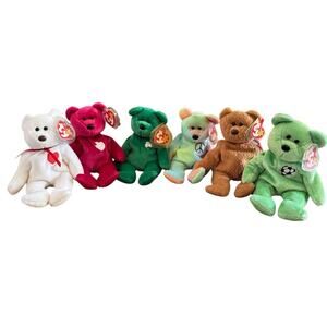 Explore the whimsical world of TY Beanie Babies with this delightful lot featuring six distinct characters: Valentino, Valentina, Peace, Erin, Curly, and Kicks. Each beanie baby in this collection showcases the renowned craftsmanship of the Ty brand, known for creating adorable and collectible plush toys that capture the hearts of people all ages. Whether you're a seasoned collector or looking to start a new one, this assorted set presents an opportunity to own a variety of TY Beanie Babies to cherish and display. With their soft textures and charming designs, these plushies make for a cozy addition to any collection or a thoughtful gift for a loved one.