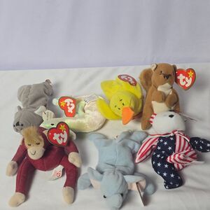 This is a rare collection of 7 TY Beanie Babies, featuring retired McDonalds exclusives from the 1990s. These collectible mini plush toys are original and most still have their tags intact, making them perfect for collectors and enthusiasts alike.