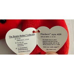 TY Beanie Babies: Pinchers The Lobster, Rare, Vintage, Mint, Retired, Style 4026