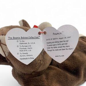 Vintage 1997 "Pounce" The Cat Beanie Babies plush toy new with original hang tag. Pounce is a lovable 8" brown cat. Photos are part of the description, please zoom in for more details.