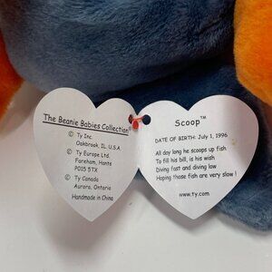 Vintage 1996 "Scoop" The Pelican Beanie Babies plush toy new with original hang tag. Scoop is a lovable 8" Pelican. Photos are part of the description, please zoom in for more details.