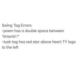 The largest tag error is the hang tag reads 1997, but the tush tag reads 1998. The rest of the tag errors are listed as pictured, at-least 12 errors noted