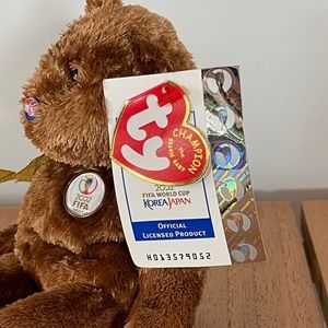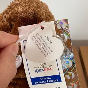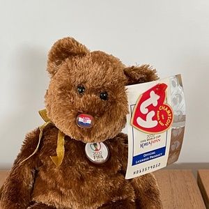 This Ty Beanie Baby commemorates the 2002 Fifa Wold Cup. It is the 'Champion' Bear from Croatia (as seen inside the heart tag). It has tags still attached and is in like new condition. No pets or smoke.
