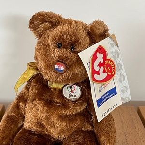 This Ty Beanie Baby commemorates the 2002 Fifa Wold Cup. It is the 'Champion' Bear from Croatia (as seen inside the heart tag). It has tags still attached and is in like new condition. No pets or smoke.