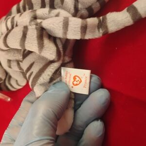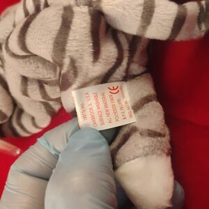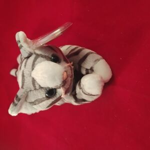 Adorable TY Beanie Baby tiger plush. Features gray and white stripes. Perfect for collectors and kids.