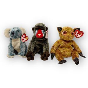 TY Beanie Baby Lot 3 Gizmo Lemur Cheeks Baboon Eucalyptus Koala Stuffed Animal