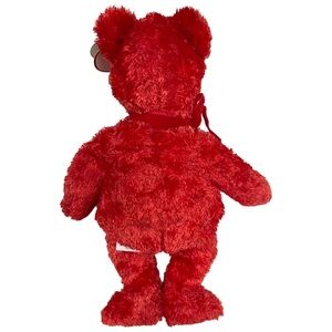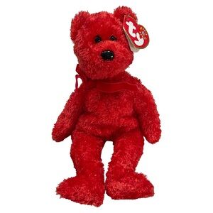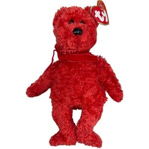 Cuddle up with this adorable Ty red teddy bear plush toy. Perfect for kids, this soft and huggable bear is a delightful companion. Ty Beanie Baby named Sizzle the Bear. This plush toy was released in 2001 and retired in 2002. Sizzle is a red bear with black eyes and a black nose, and it has a red ribbon tied around its neck. The tag indicates its birthday is August 25, 2001. The poem inside the tag reads: "Look at me, I'm quite a bear. I love my soft and furry hair. Make me sizzle, is what I said. That's why I'm such a vibrant red!".