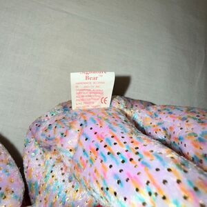 • Pastel confetti-sparkle plush with a lavender ribbon.