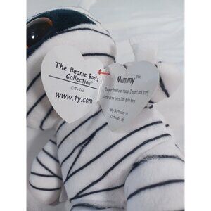 Introducing a classic Ty Beanie Boos plush toy, measuring approximately 6 inches in size. This particular Beanie Boos is named "Mummy" and features glittery eyes that make it a unique addition to any collection. The original tags are still attached, ensuring the authenticity of the product.