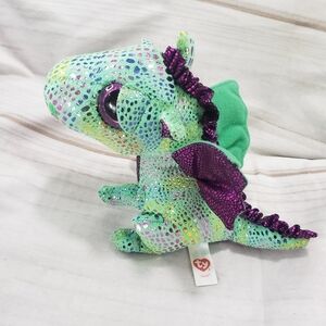 This TY Beanie Boos Cinder Dragon plush stuffed animal is a must-have for any fan of the dragon character family. The 6-inch toy is made by Ty, a well-known brand in the toy industry. It features a combination of green, purple, and rainbow sparkle colors that make it a visually appealing addition to any collection.