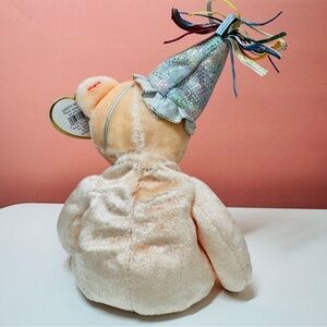 Celebrate October birthdays in style with this adorable 2002 TY Birthday Beanie Baby! This cream-colored bear features a shiny silver party hat with rainbow fringe, a metallic gold nose, and a stitched present with “October” embroidered on its chest.