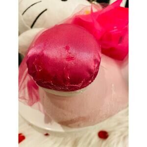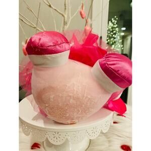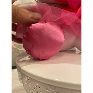 Added embellishment on bow and ribbon. Please see pics for damage. The bottom and feet has glue but not noticeable when plush is sitting up.