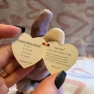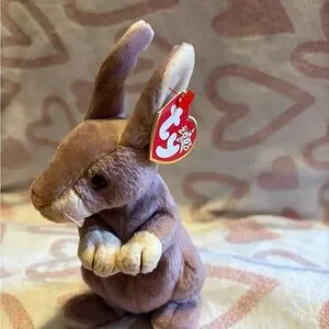 Soft brown plush bunny with light cream paw and ear accents. Realistic stitched features and upright ears. Includes original red Ty heart tag. Cute collectible for plush lovers.