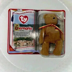This is a new with tags and box Ty Beanie Baby "Germania" the Bear from the International Bears II collection. The bear is brown with a German flag sewn onto its chest. It is approximately 6 inches tall and made of plush fabric. The packaging is a cardboard book with a clear plastic window showing the bear. The book has a McDonald's logo and information about the bear, including its date of introduction and date of birth. The back of the book lists other Beanie Babies in the collection. The item is in excellent condition minus the packaging being open in the back of much is shown in multiple photos!