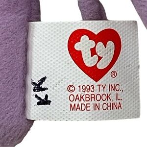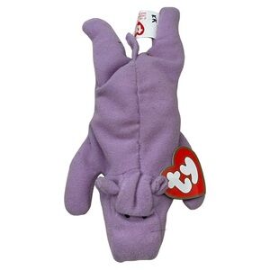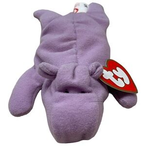 Adorable TY Beanie Baby hippo plush in a lovely purple shade. Perfect for collectors and kids alike. "Teenie Beanies" are miniature versions of Beanie Babies distributed as McDonald's Happy Meal toys. The Beanie Baby in the image is not a "Teenie Beanie" due to its size and the tag design. "Teenie Beanies" have a different tag and are much smaller in size compared to the original Beanie Babies.