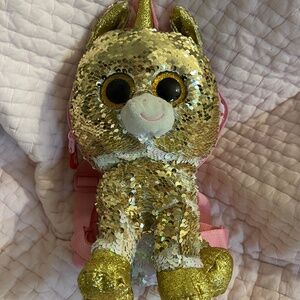 Excellent use condition TY Fantasia, backpack, wearable, stuffed animal unicorn with reversible sequins that switch from silver to gold.