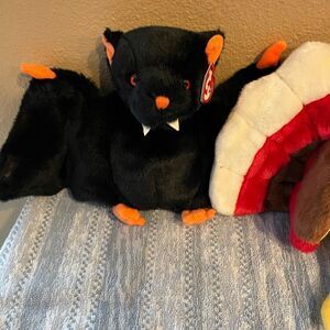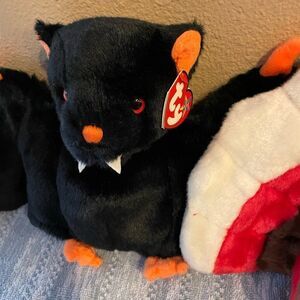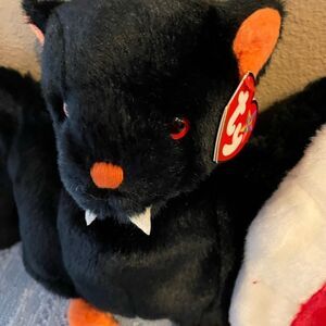 Early 2000’s. Both of these guys are big and hard to find! Still with their original tags! I won’t separate them. You’ll have Halloween and thanksgiving covered! Buddy the bat has bright red eyes! He’s so cool! Big wing span! 15 inches! They are both really cool! And soft! Clean home!