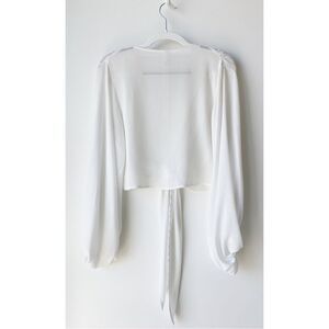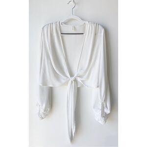 Gorgeous tie front semi-cropped top with billowing, tapered sleeves and deep v neckline ! In great condition. Top in the stock photo is not the exact top but very similar!