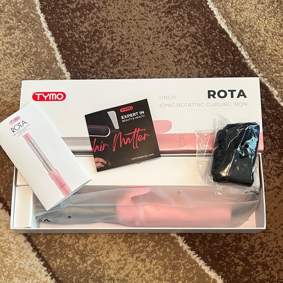 TYMO ROTA curling iron in a sleek pink design. Features an ionic rotating mechanism.