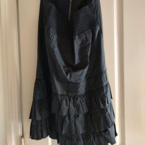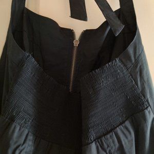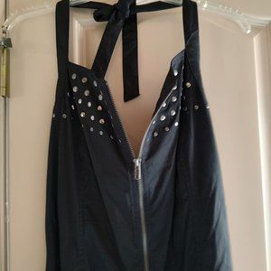 BRAND NEW/NEVER WORN BLACK STUDDED HALTER DRESS THAT ZIPS UP THE FRONT. BOTTOM HAS THREE RUFFLED LAYERS (95% COTTON; 5% SPANDEX). DRESS IS LINED AND BACK HAS A FLEXIBLE BAND. THERE ARE OPTIONAL BELT LOOPS ABOVE THE RUFFLES.