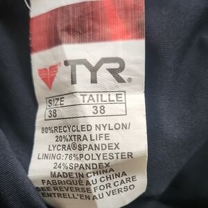 TYR swimsuit, size 38 swimwear, racerback one-piece, athletic swimsuit, training swimsuit, black and blue bathing suit, competitive swimwear, lap swim suit, chlorine-resistant