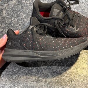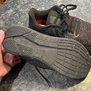 Comfortable black sneakers with eye-catching red speckles. Ideal for active lifestyles. Running style shoe. Worn less than 5 times. Size 9.