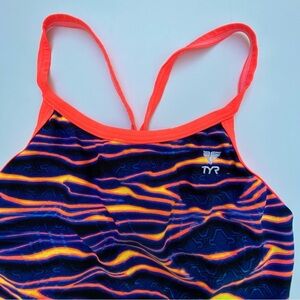 TYR Cadence Diamond Fit Swimsuit in pre-owned condition. See pics for wear. Does have a chlorine odor. There is no size tag. Appears to be a L/XL . Multi-colored.