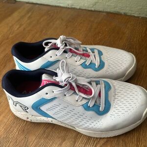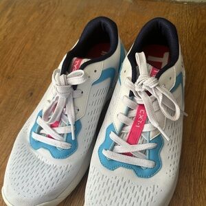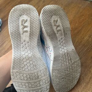 Stylish TYR athletic shoes. White with blue accents. Comfortable and durable design.