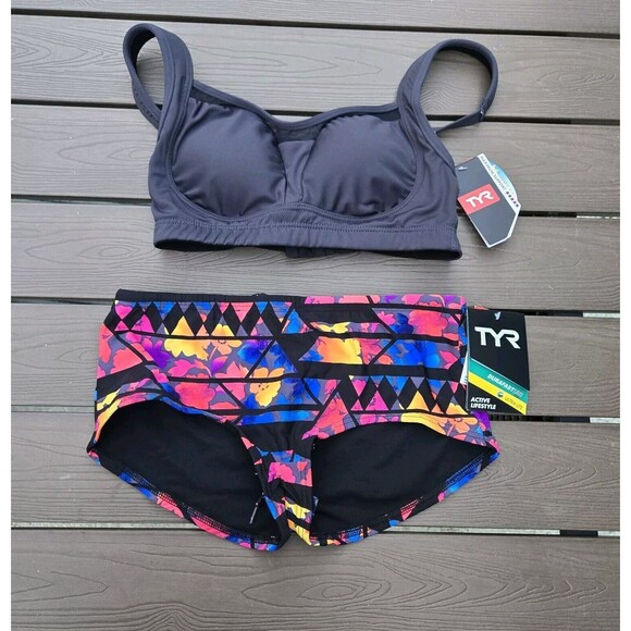 Look stylish and feel comfortable in this TYR women's bikini set. The set includes a solid grey Lily top and Santa Rosa cheeky boy shorts in size S. The top features a classic striped pattern and is designed as a tank style, while the shorts have a multicolor design and are easy to care for. This 2-piece set is perfect for a day at the beach or pool, and it's sure to make you look great.