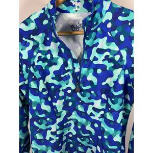 Pullover. Quarter zip front closure. Stand up mock collar. Long sleeves with ruching at wrists. UPF 50 sun protection. Light stretch. Moisture wicking. Quick dry. Shades of blue, light pink, and green camouflage print throughout. Sporty. Golf. Activewear. Pickleball. Resort. Country club. G