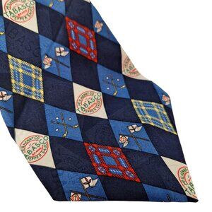 Tabasco hot sauce novelty necktie featuring golf flags and diamond shapes in multicolor.