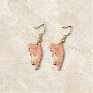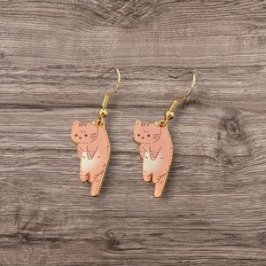 These charming earrings feature a playful design of tabby cats, crafted from lightweight materials for comfortable wear. The cartoonish style captures the essence of a cat's playful nature, complete with pointed ears, whiskers, and a long tail. Finished with gold-colored ear wires, they add a touch of whimsy to any outfit.