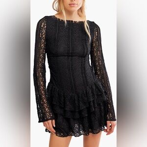 Floaty layered ruffles add fluttering movement to this leggy-length dress framed by semisheer sleeves and romanced by intricate lace.