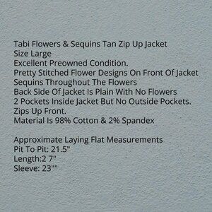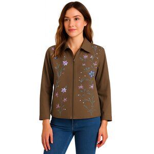 Tabi Size LG Flowers & Sequins Tan Zip Up Jacket